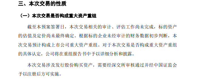 百纳千成表示,本次交易相关的审计、评估工作尚未完成,标的资产的估值及定价尚未最终确定。根据标的企业未经审计的财务数据初步判断,本次交易预计构成上市公司重大资产重组。对于本次交易是否构成重大资产重组的具体认定,公司将在重组报告书中予以详细分析和披露。